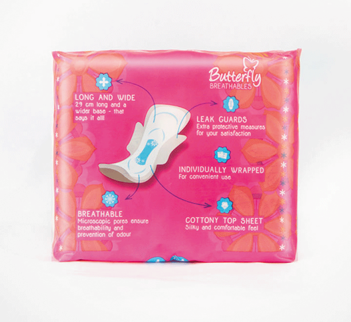 NEW Butterfly Breathables Long Maxi Thick Cottony Soft Napkin with Super Absorbent Core . It has a premium Silky Cottony Top Sheet with a long and wide base for maximum coverage. Its cottony wings make it comfortable and the microscopic pores on the back sheet help make the napkin 100% breathable