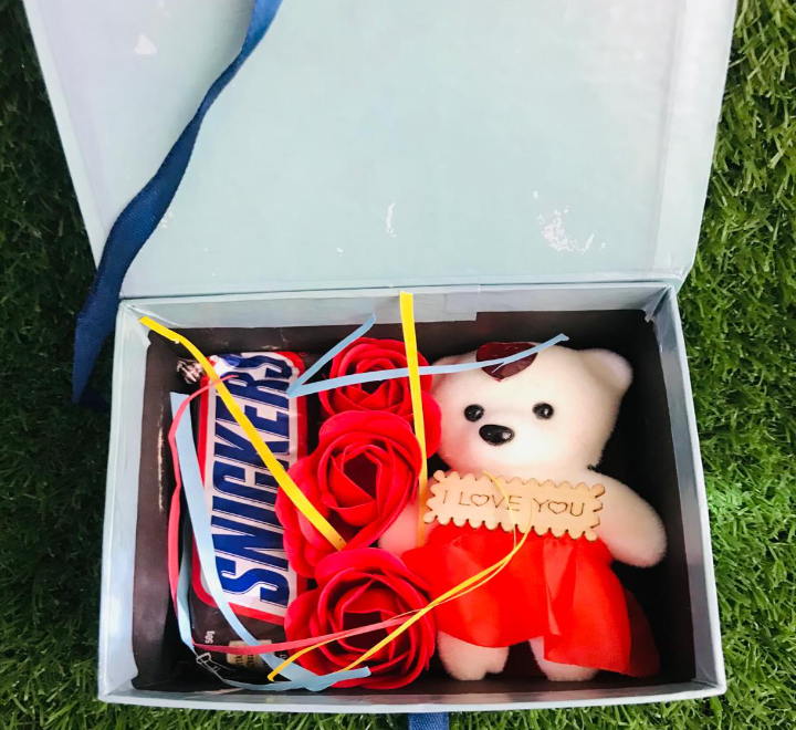 | What's in the box | 1 x snicker chocolate, 1 x small cute teddy, 3 x fragrance roses |